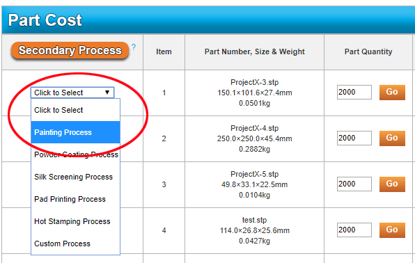 Part of the online quoting system includes an option to select secondary processes. These processes include painting, ultrasonic welding, hot plate welding, heat pressing, heat staking, post-molding machining, pad printing, and screen printing.Powder coating for injection molding